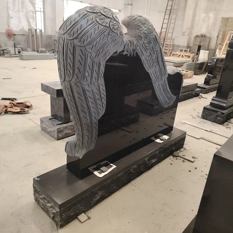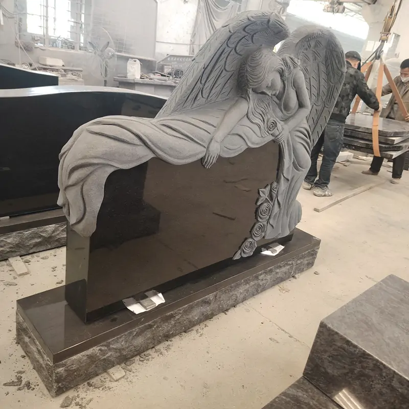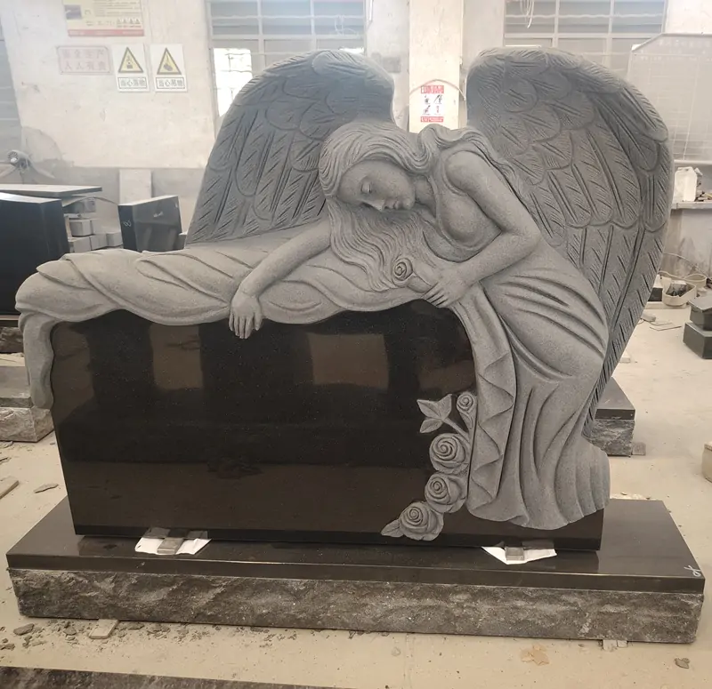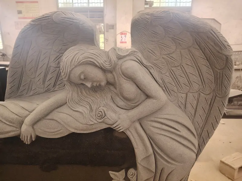 Dressed in a robe with delicate folds, the angel rests tenderly on the tombstone, conveying an atmosphere of tranquility and protection.
